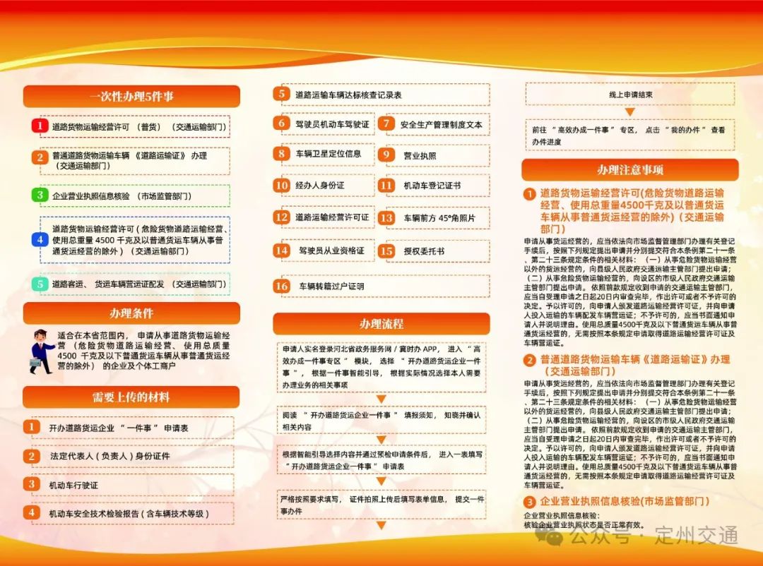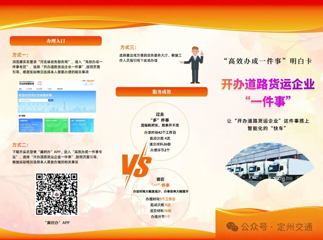 社会 定州市交通运输局开办道路运输企业“一件事”一次办、网上办为进一步优化营商环境,提升政务服务效率,定州市交通运输局积极响应国家“放管服”改革要求,围绕开办道路货运企业,推出“一件事”一次办、网上办服务,让“开办运输企业”这件事搭上智能化的“快车”。 全面梳理和整合涉及开办道路货运企业的相关“单事项”及办事环节,形成“开办运输企业一件事”。优化办事流程,减少不必要的审批环节,实现“减环节、减时间、减材料、减跑动”,确保创业者只需提交一次材料,即可完成所有审批和备案手续,提升群众办事的便捷度、体验度和满意度。